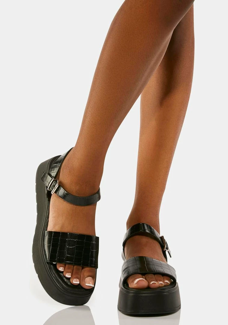 come in a vegan leather construction, with a platform sole, a vegan croc foot and ankle strap, and a buckle closure.
