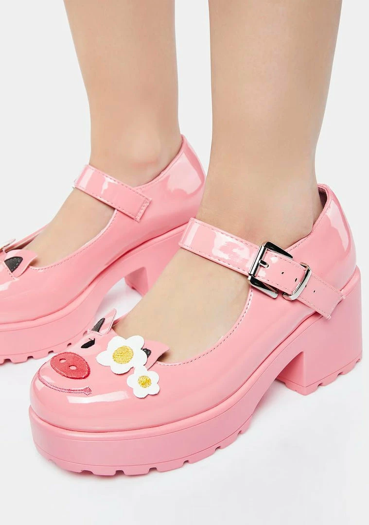 cuz you’re the cutest in the barnyard! These platform mary janes have a patent vegan leather construction, adorable pig face designs with flower details, chunky block heels, and adjustable buckle strap closures.