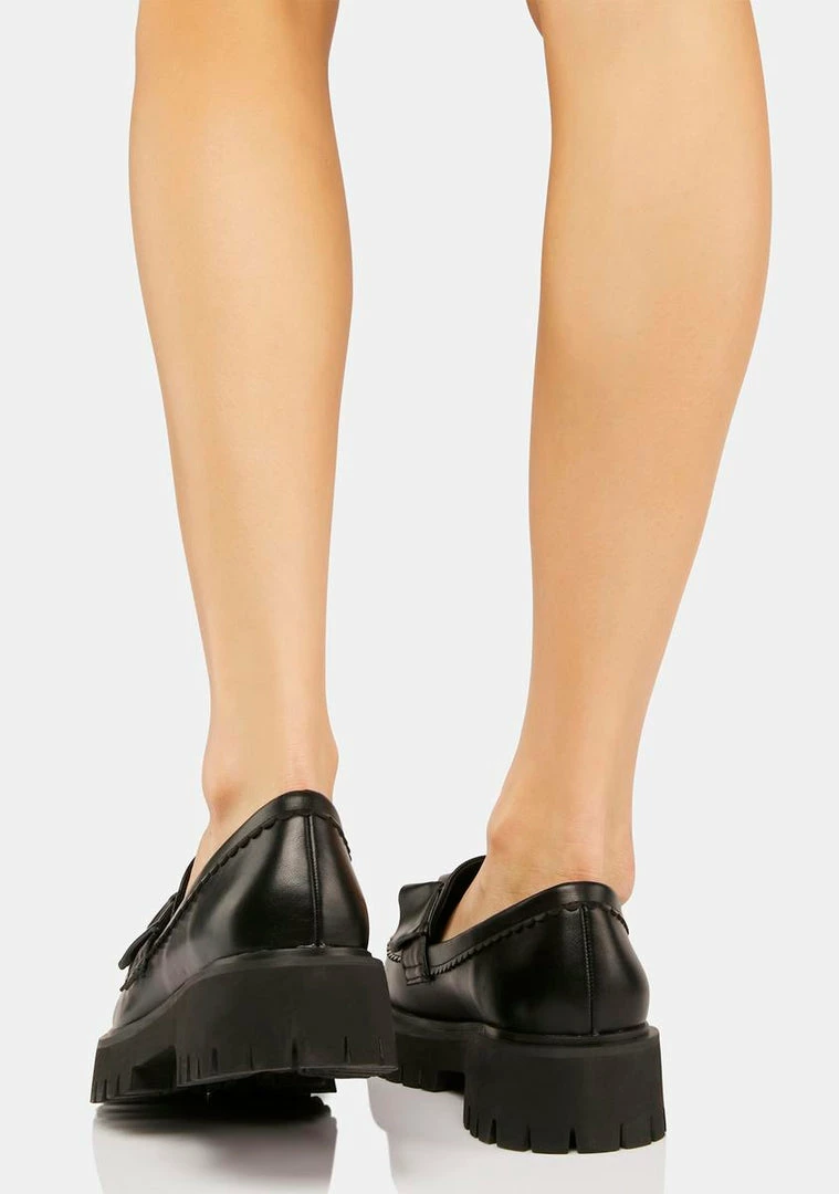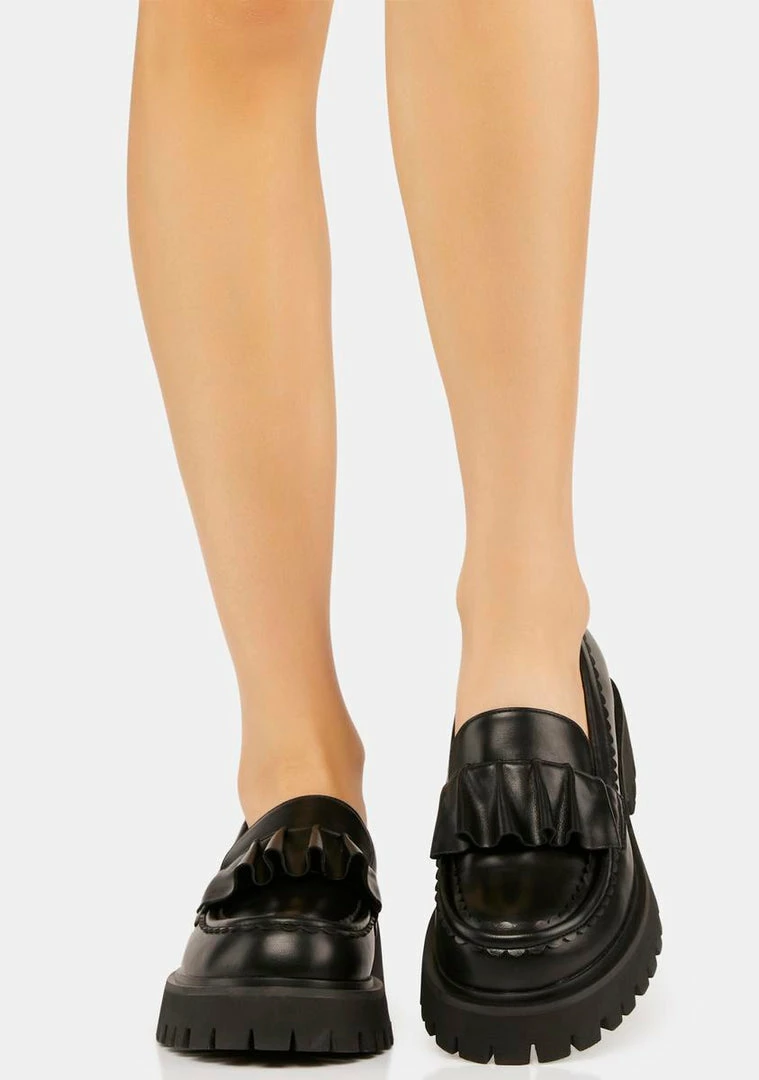 cuz you get straight to the point. These loafers come in a vegan leather construction, with platform treaded sole, scallop stitching details, and a vegan leather ruffle detail at top.